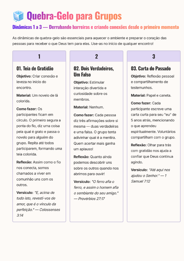 Se você é líder de célula, professor da EBD, líder de jovens ou participa da organização de encontros na igreja, sabe como momentos interativos fazem toda a diferença para quebrar o gelo, aproximar pessoas e tornar os encontros muito mais marcantes.