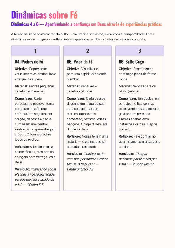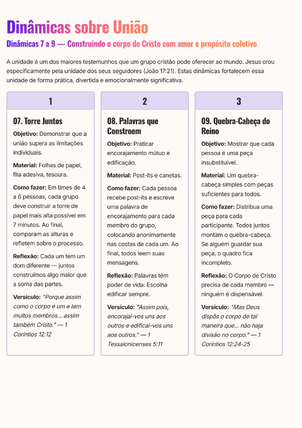 Pensando nisso, foi criado o eBook “50 Dinâmicas Criativas para Cultos, Células e Reuniões”, um guia prático com atividades inovadoras que ajudam a trazer alegria, reflexão espiritual e conexão verdadeira entre os participantes.