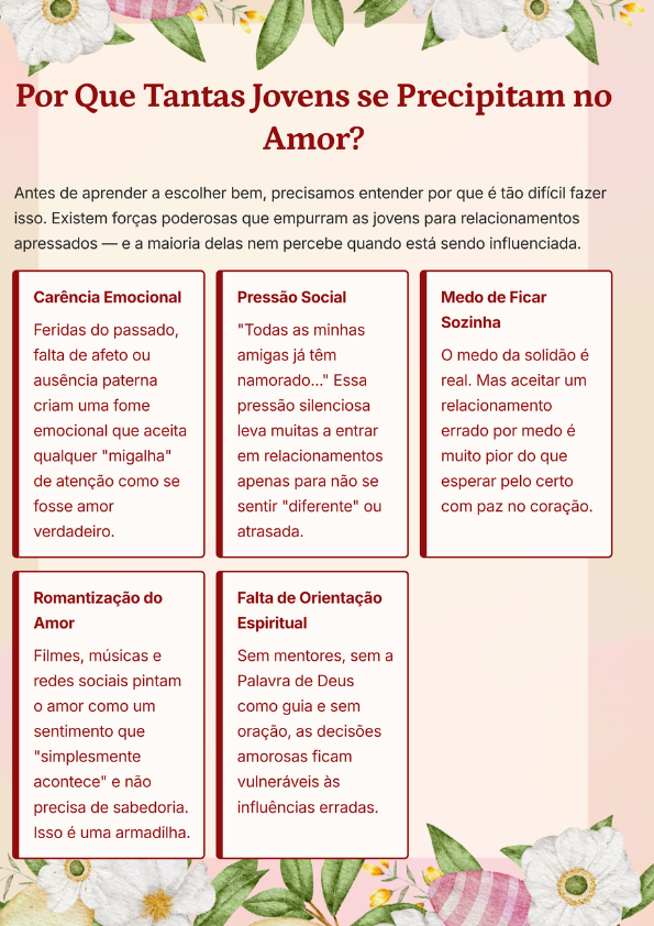 Este material foi criado especialmente para jovens mulheres que desejam evitar escolhas precipitadas e construir um futuro baseado em fé, propósito e sabedoria.