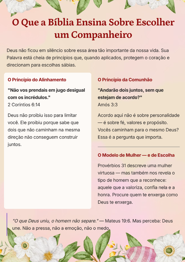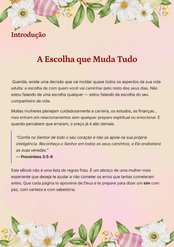 Se você deseja fazer uma escolha consciente, proteger seu coração e construir um relacionamento alinhado com os princípios de Deus, este eBook é para você.